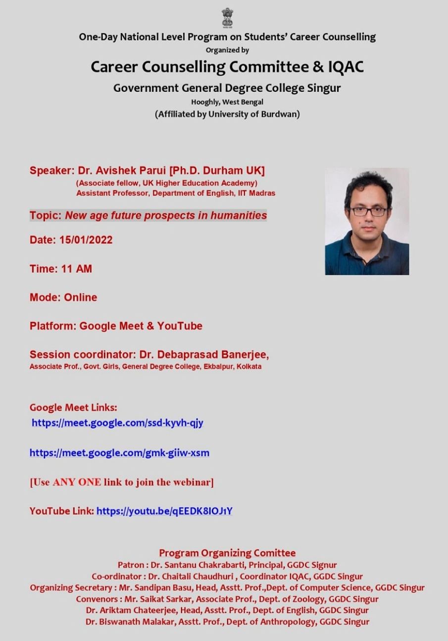 - In association with IQAC, GGDC Singur, the Career counselling sub-committee has been organizing several programmes that help students to explore different paths in higher studies as well as in the field of job. Experts from different domains (such as SEBI, RICE, GEORGE TELEGRAPH) have given their valuable insights to students. Students both from science and humanities stream participate in these programs actively.