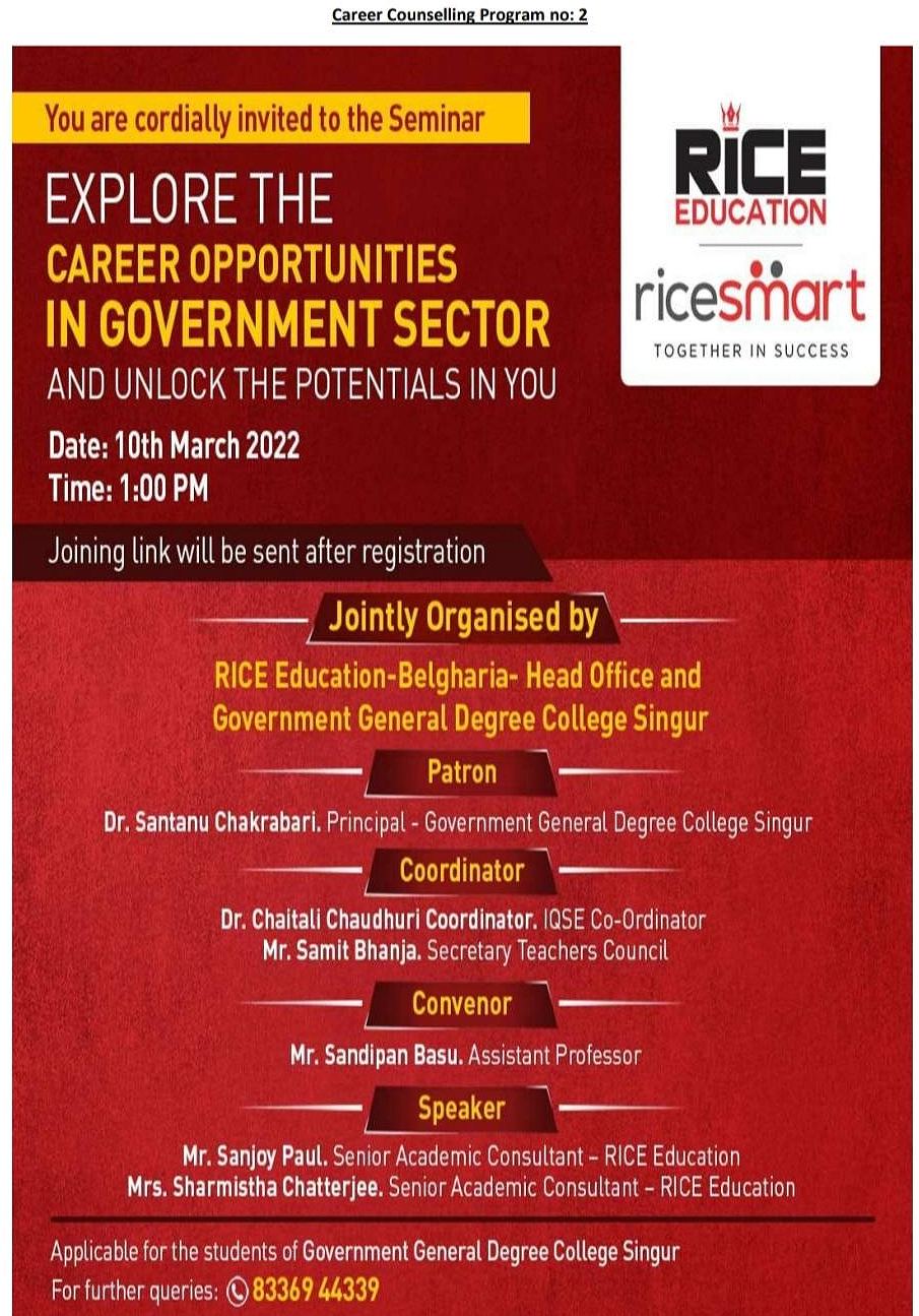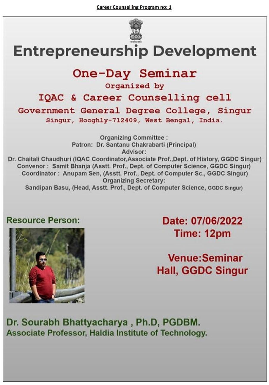 - In association with IQAC, GGDC Singur, the Career counselling sub-committee has been organizing several programmes that help students to explore different paths in higher studies as well as in the field of job. Experts from different domains (such as SEBI, RICE, GEORGE TELEGRAPH) have given their valuable insights to students. Students both from science and humanities stream participate in these programs actively.